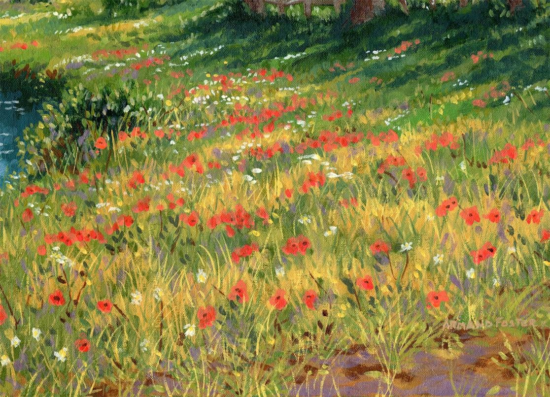Wonderfully relaxing oil on canvas painting of a riverside meadow full of wild flowers, especially eye-catching red poppies in full bloom.