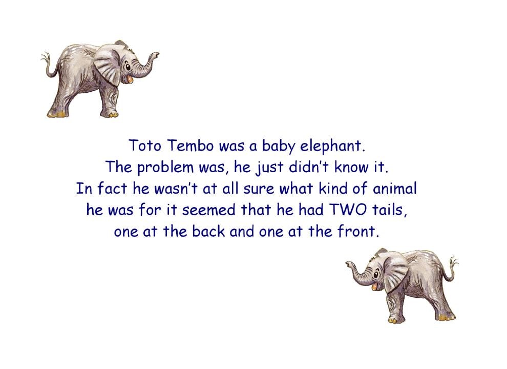 A wonderful illustrated story of Toto the Baby Elephant who thought he had two tails, one at the front and one at the back. Follow him as he meets Koro the Marabou Stork, Jomo the Aardvark, Kiko Cobra and Mamba the Nile Crocodile on his journey to find out what his front 'tail' is really for.